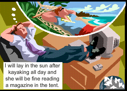 | "I will relax after a day of kayaking. She will be fine reading some woman magazine in the tent." |